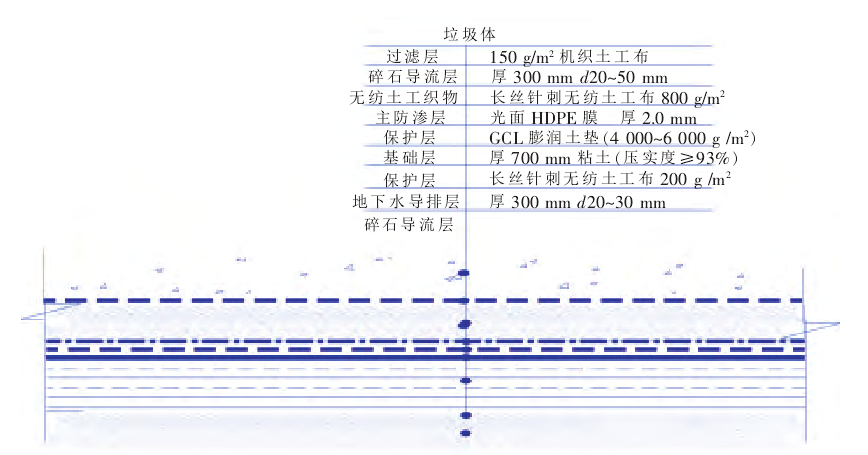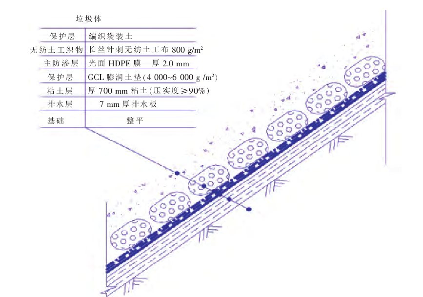 粘土的渗透系数可以满足膜下制作保护层的要求,因此防渗系统可以采用单层衬砌结构的水平防渗。